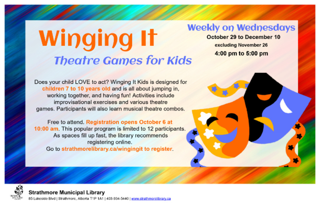 Does your child LOVE to act? Winging It Kids is designed for children 7 to 10 years old and is all about jumping in, working together, and having fun! Activities include improvisational exercises and various theatre games. Participants will also learn musical theatre combos.