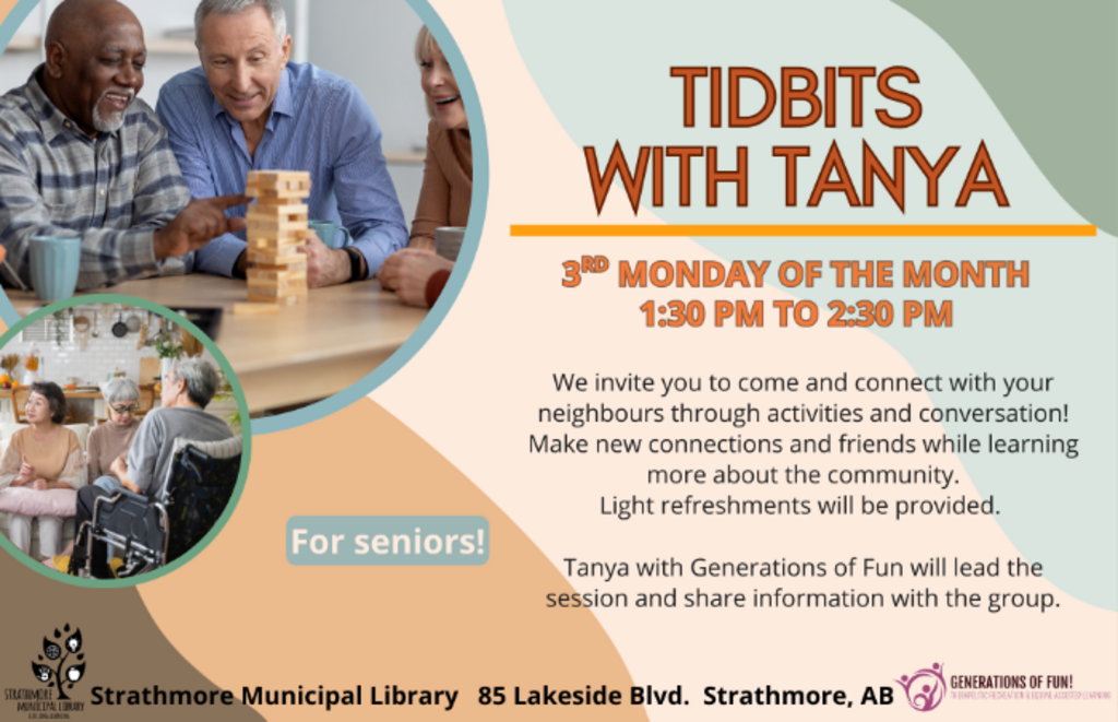 We invite you to come and connect with your neighbours through activities and conversation! Make new connections and friends while learning more about the community. Light refreshments will be provided. For seniors.
