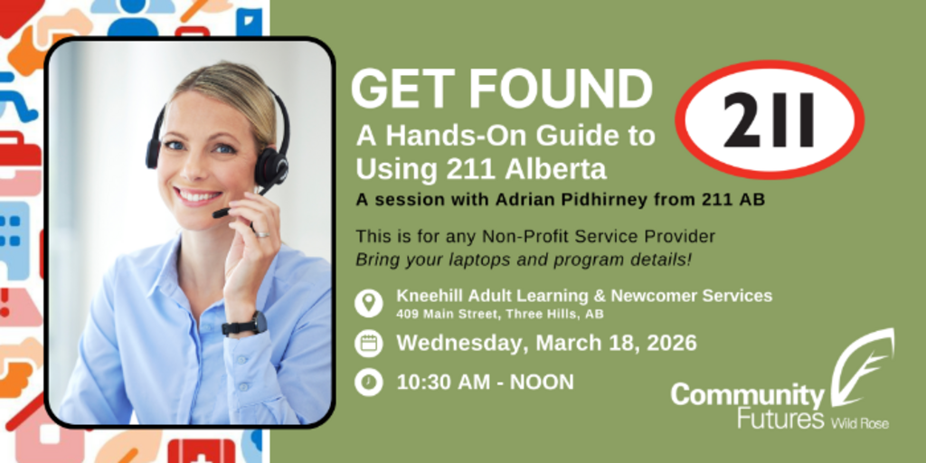 Connect more people to your services by learning how to leverage 211 Alberta and getting your organization listed correctly on this essential provincial resource hub. This 211 Alberta session will be offered in a hybrid format, with the option to attend virtually or in person, so non-profits from across the region can take part in the overview and hands-on listing support. Discover how 211 Alberta connects residents to local community, social, health, government, and crisis supports 24/7, and why your non-profit’s programs need to be there.