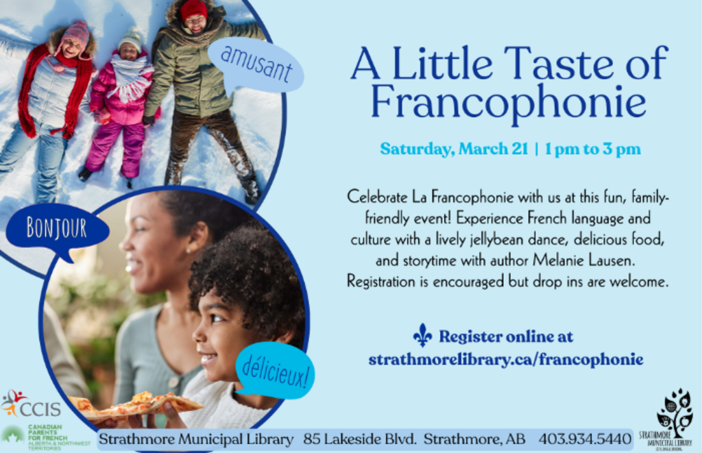 Registration is encouraged but drop ins are welcome. Register online at strathmorelibrary.ca/francophonie.