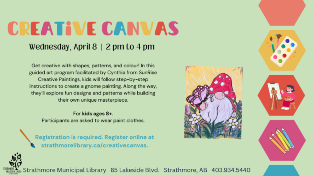 Registration is required. Register online at www.strathmorelibrary.ca/creativecanvas.